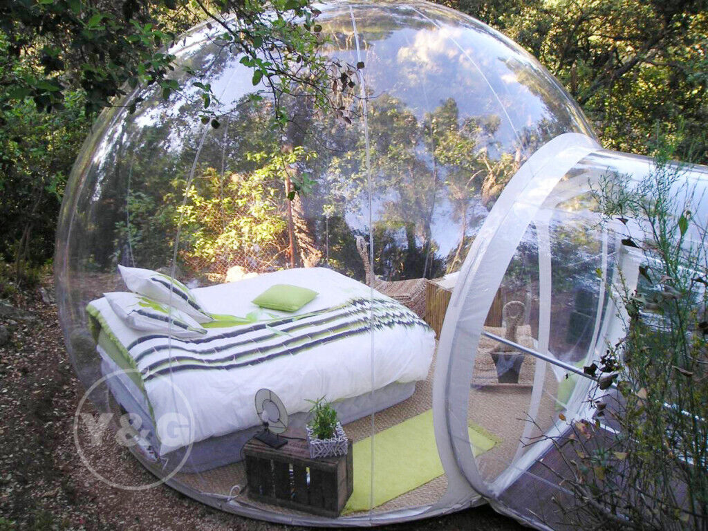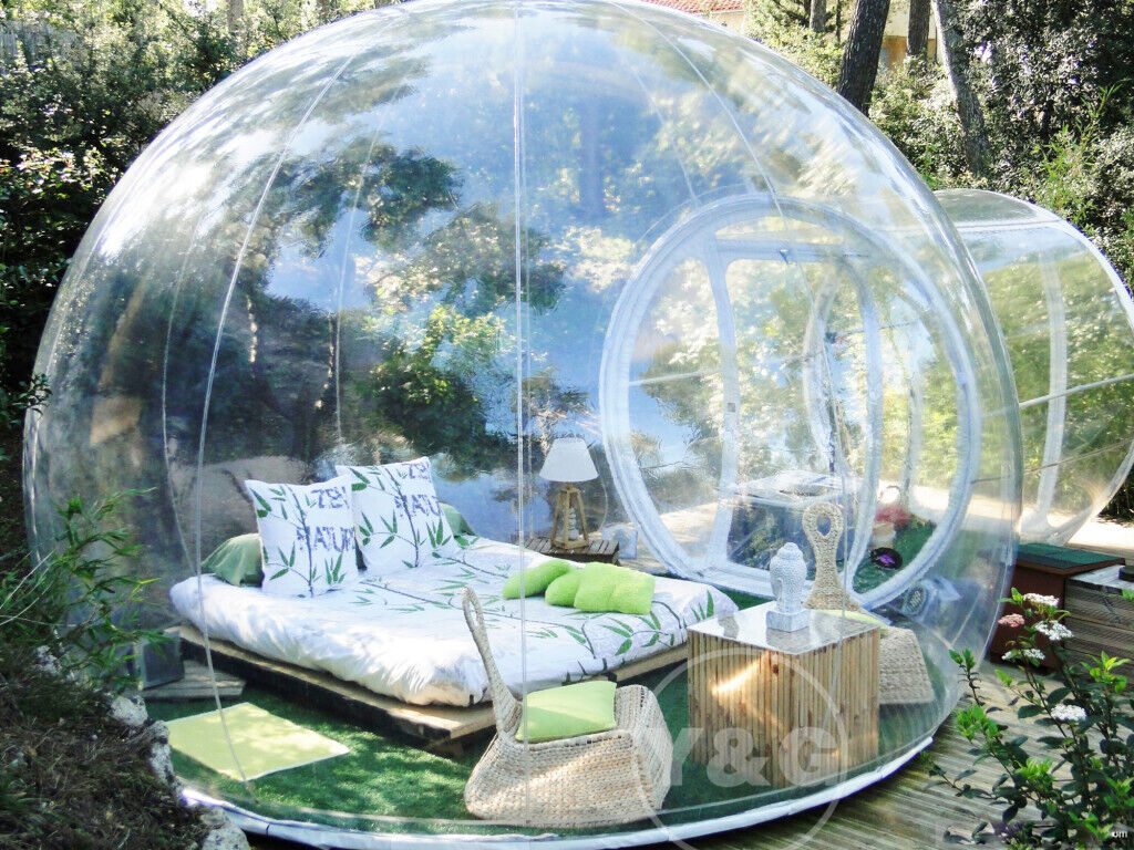 It must be an unforgettable experience to enjoy the beautiful natural scenery and sleep under the tranquil starry sky in this transparent inflatable tunnel bubble tent
