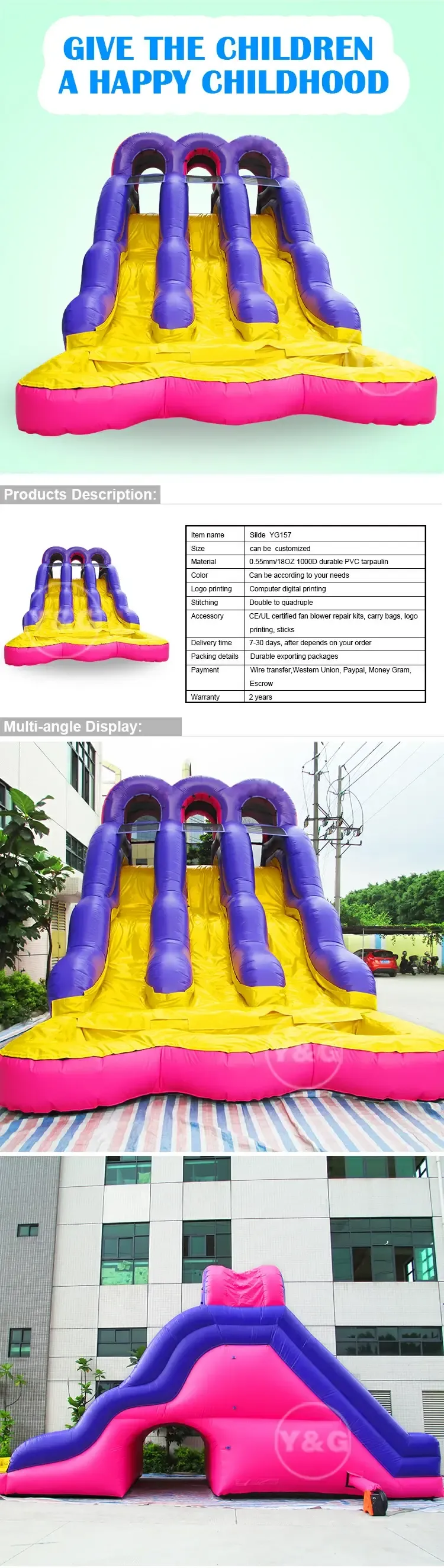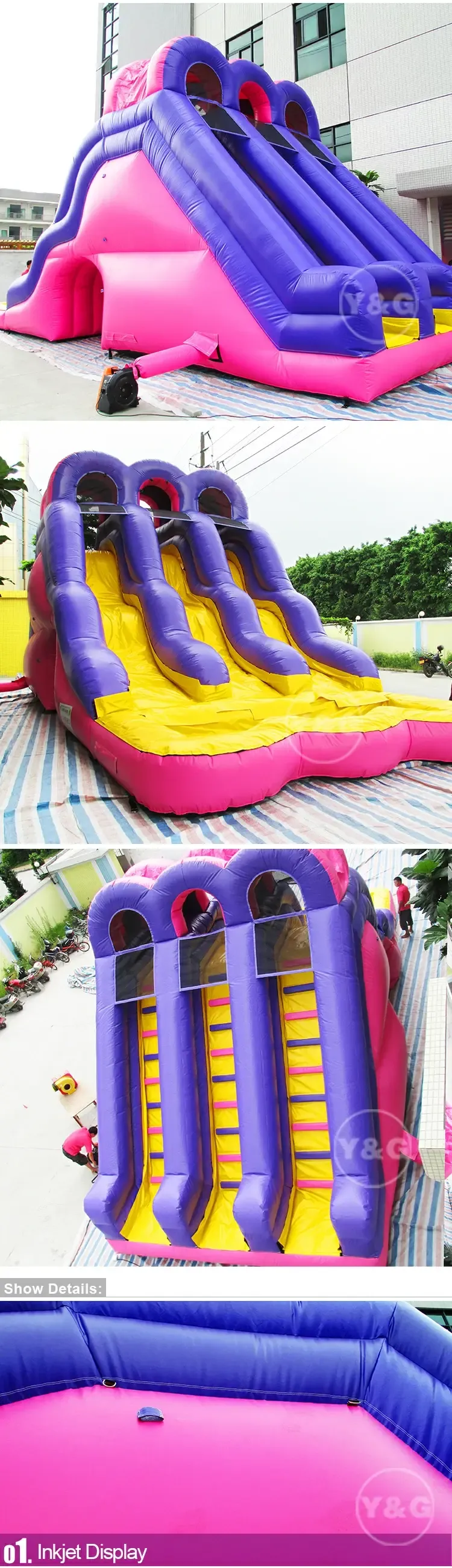 Pink Bouncer Slide with a steep, straight descent for an intense, adrenaline-pumping experience. Incorporates sturdy handrails, a rapid slide path, and a deep splash pool or heavily padded landing zone for maximum impact absorption.